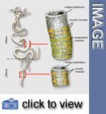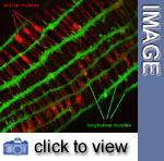 Confocal image of GFP/propidium iodide double-labelled circular and longitudinal visceral muscles in a 3rd instar larva